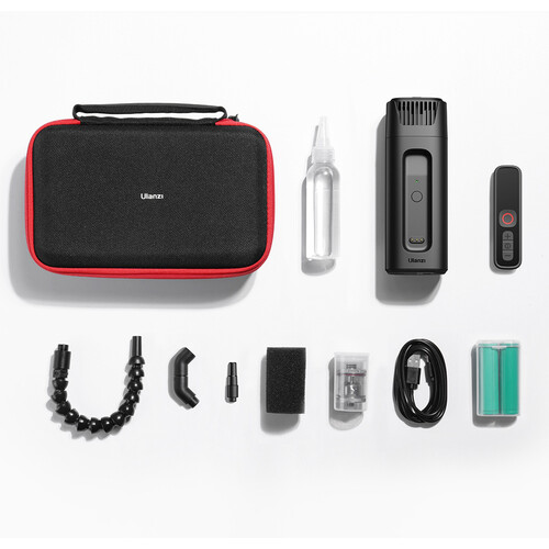 Add a foggy atmosphere to your photography, events, or stage with the handheld FM01 FILMOG Ace Portable Fog Machine from Ulanzi. This highly portable fog machine suits multiple scenarios, such as parties or weddings. The oil tank capacity is 8mL. Manually release fog or use the supplied remote control for convenient use from a distance. The kit includes a remote control, an atomizing chamber, the necessary fog juice, other essential tools, and a protective case that holds everything.